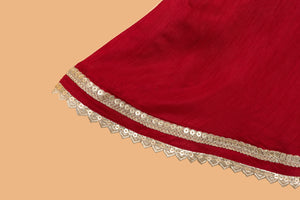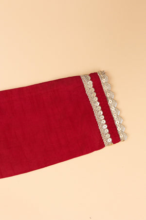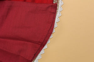 Maroon colored silk long frock adorned with scallop lace around the neckline, sleeve hem and bottom hem with potli buttons.