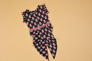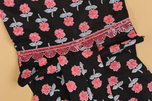 Black colored floral printed one piece jumpsuit with frills around neckline and armhole and lace adorned at waistline.