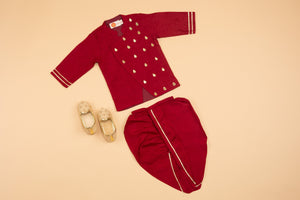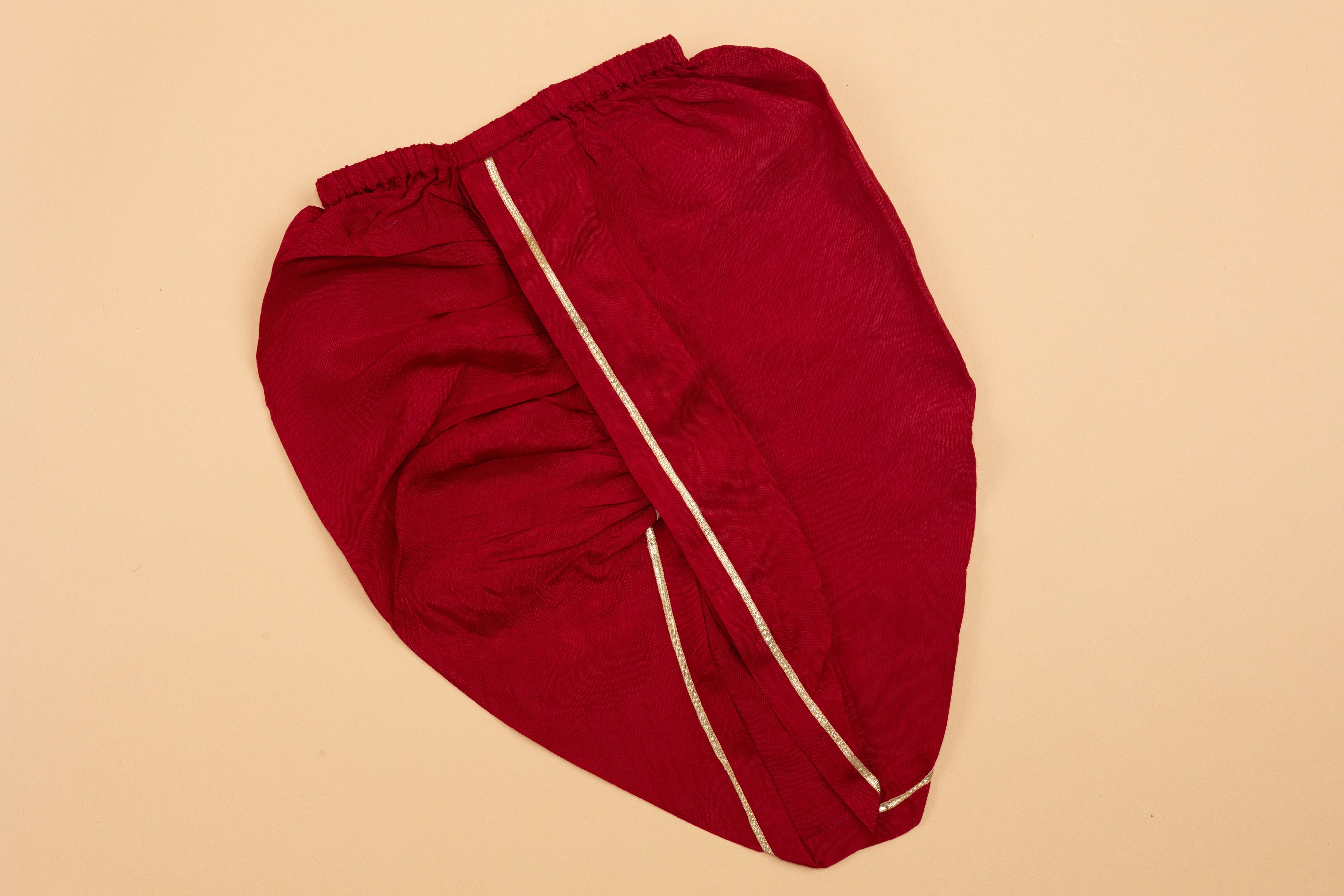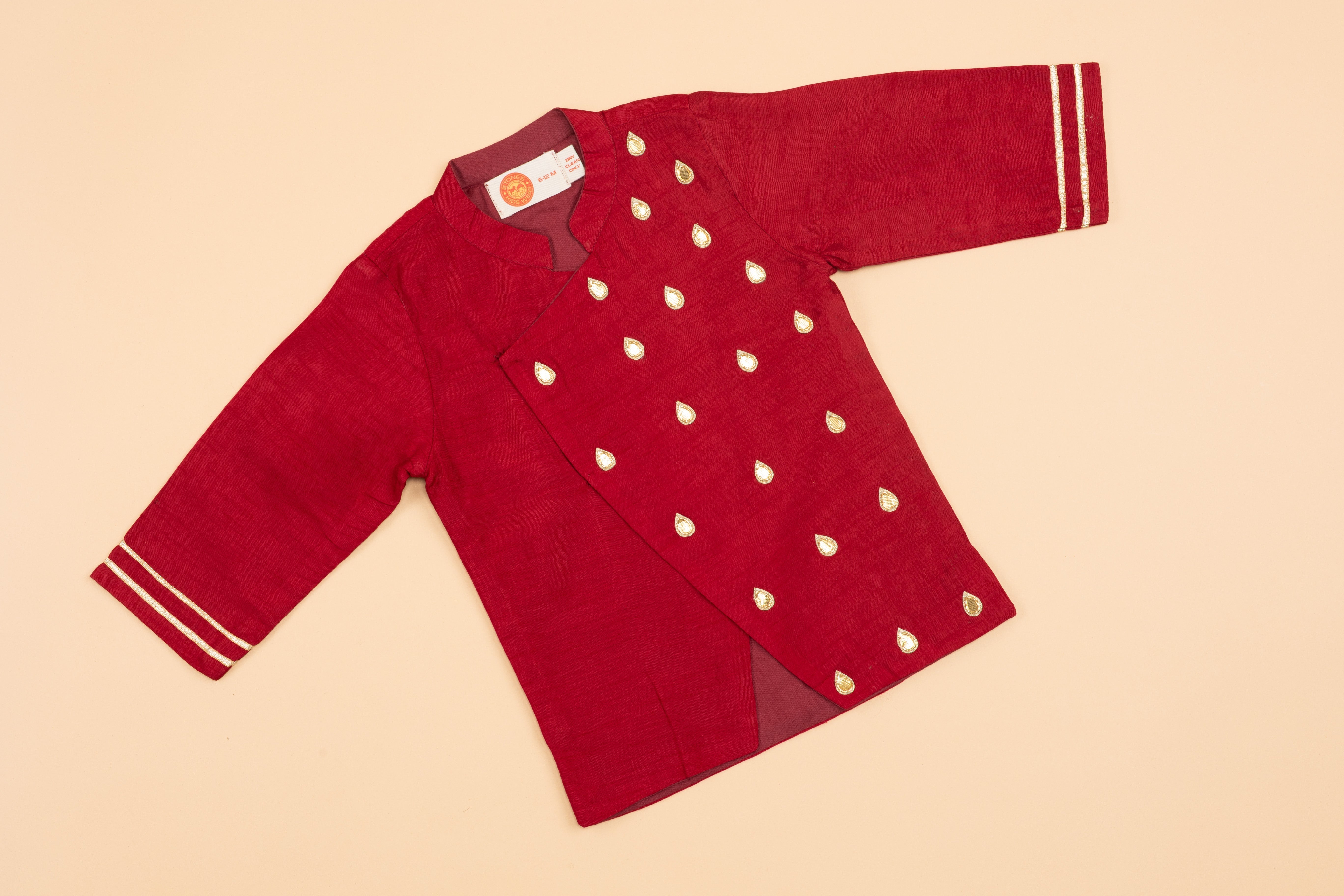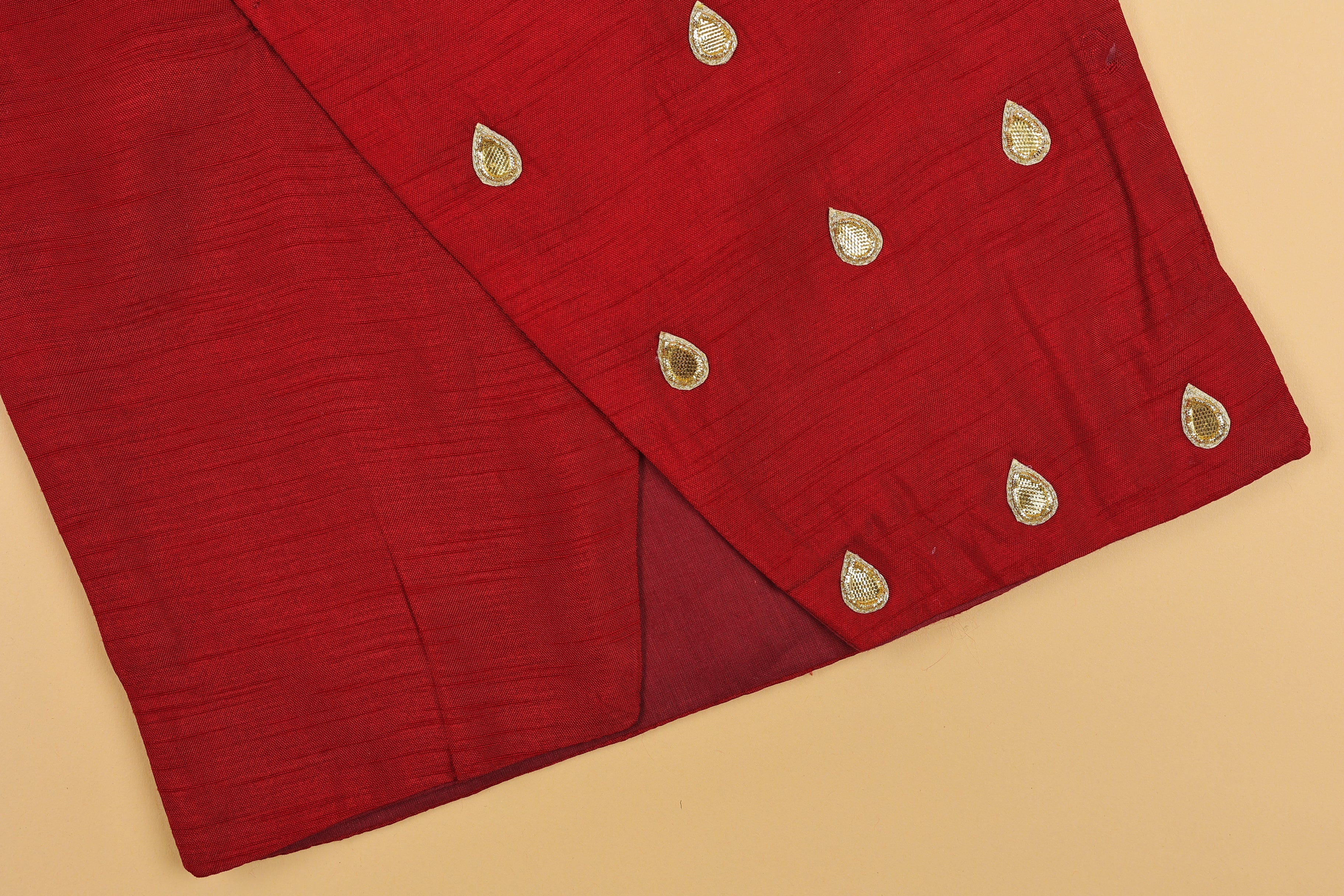 Maroon colored silk kurta with stylish cut and embellishments all over and hook opening in the front and gold lacework at the sleeve hem.
