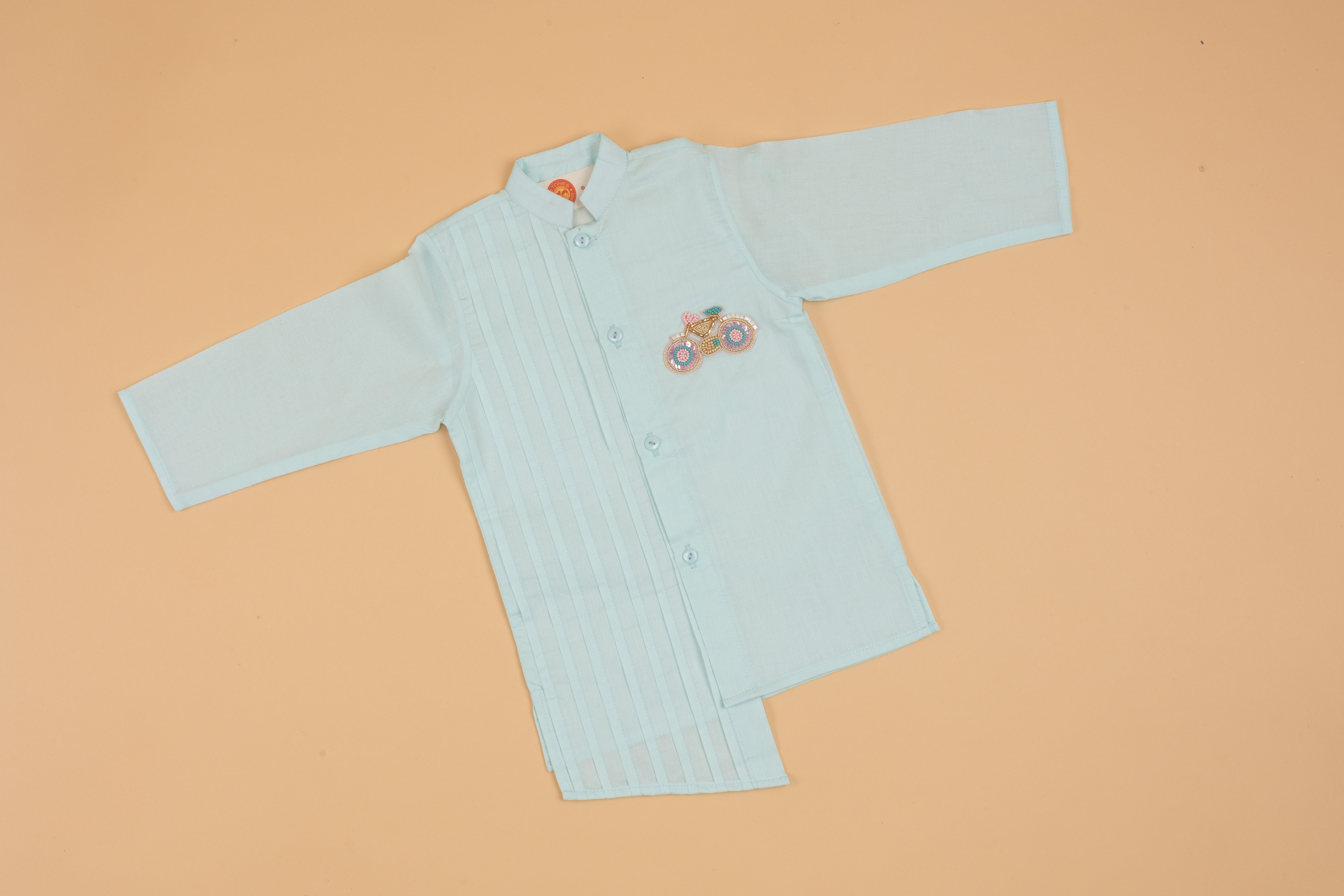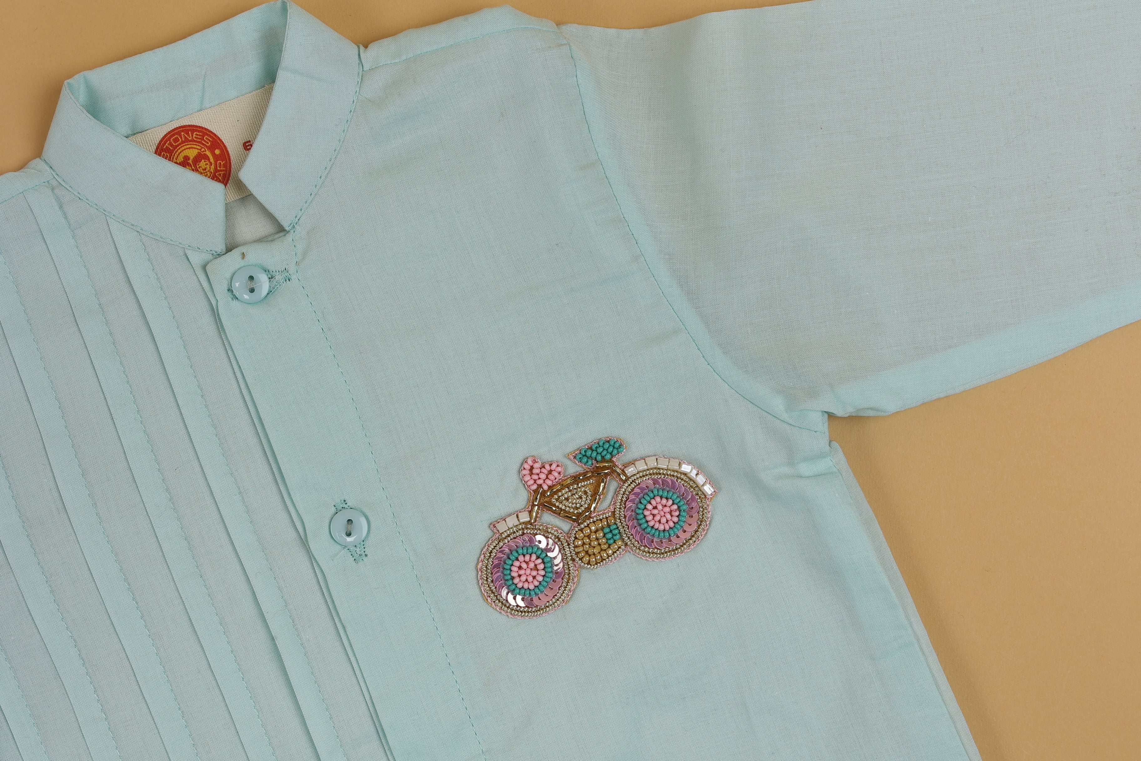 Blue colored cotton kurta featuring pintucks on left side of the button panel and adorned with cycle patchwork on the right side.