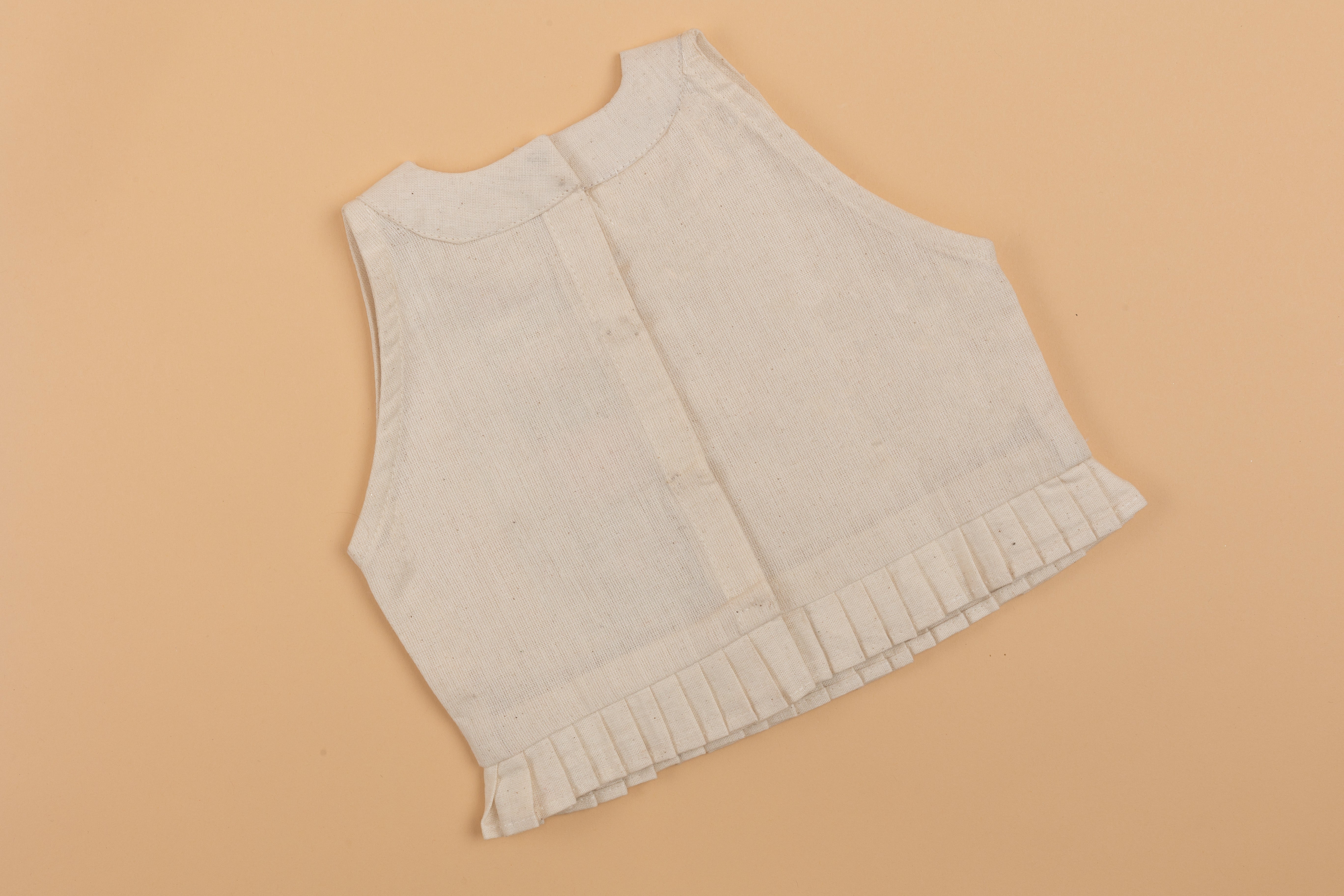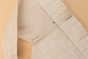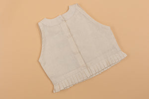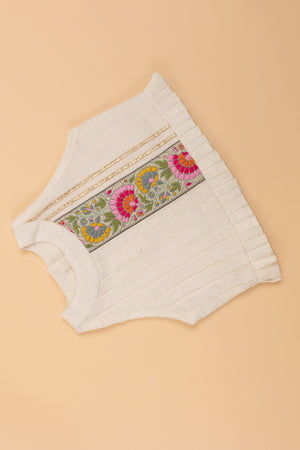 Khadi colored cotton crop top embellished with lacework on one side and pintucks on the other side with frilly hem.