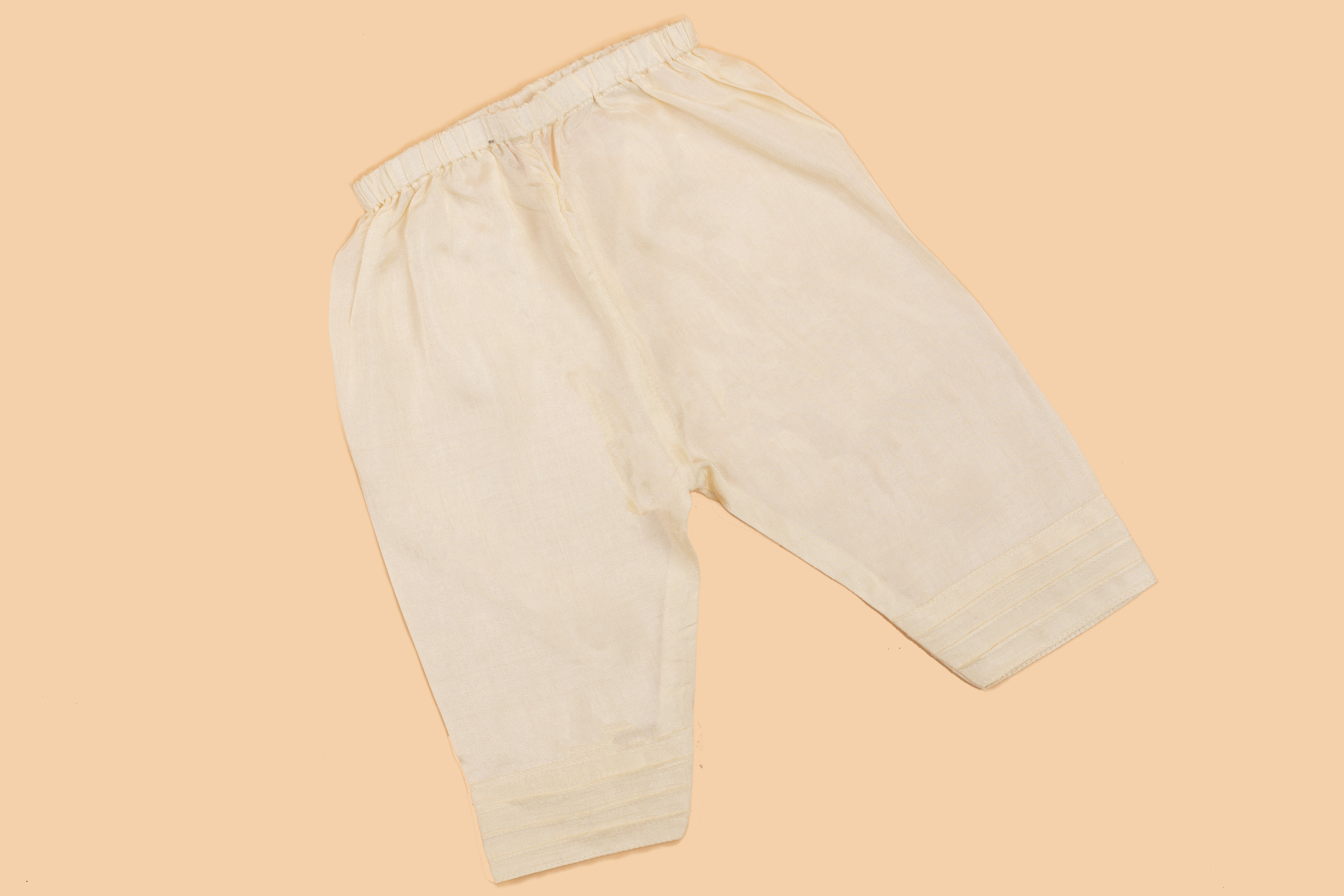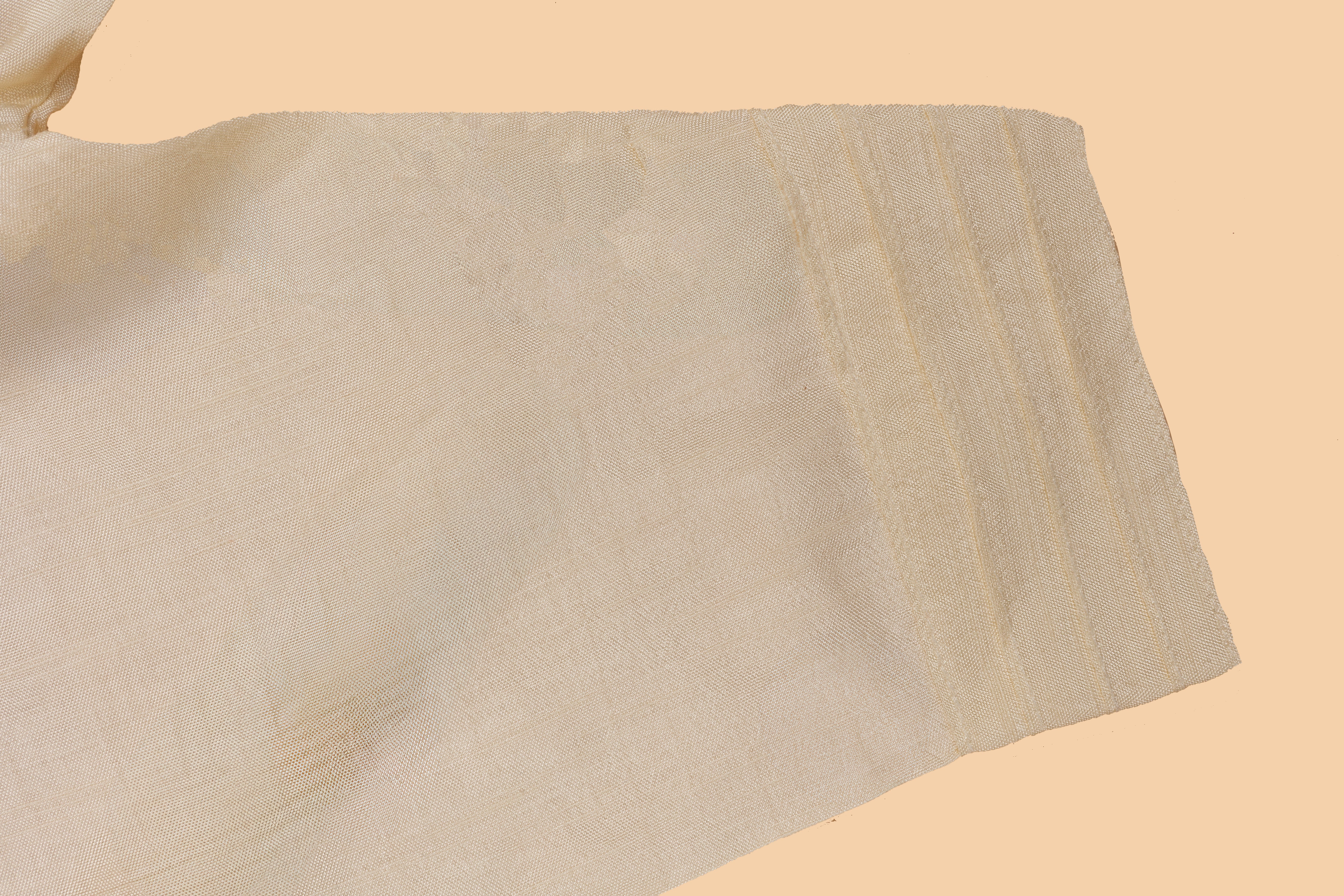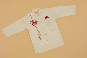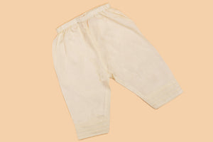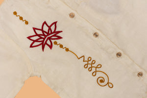 Cream colored silk kurta with lotus thread embroidery on the left side of the button panel and welt pocket on the right side. It also features pintucks on the kurta hem, sleeve hem and pyjama hem.