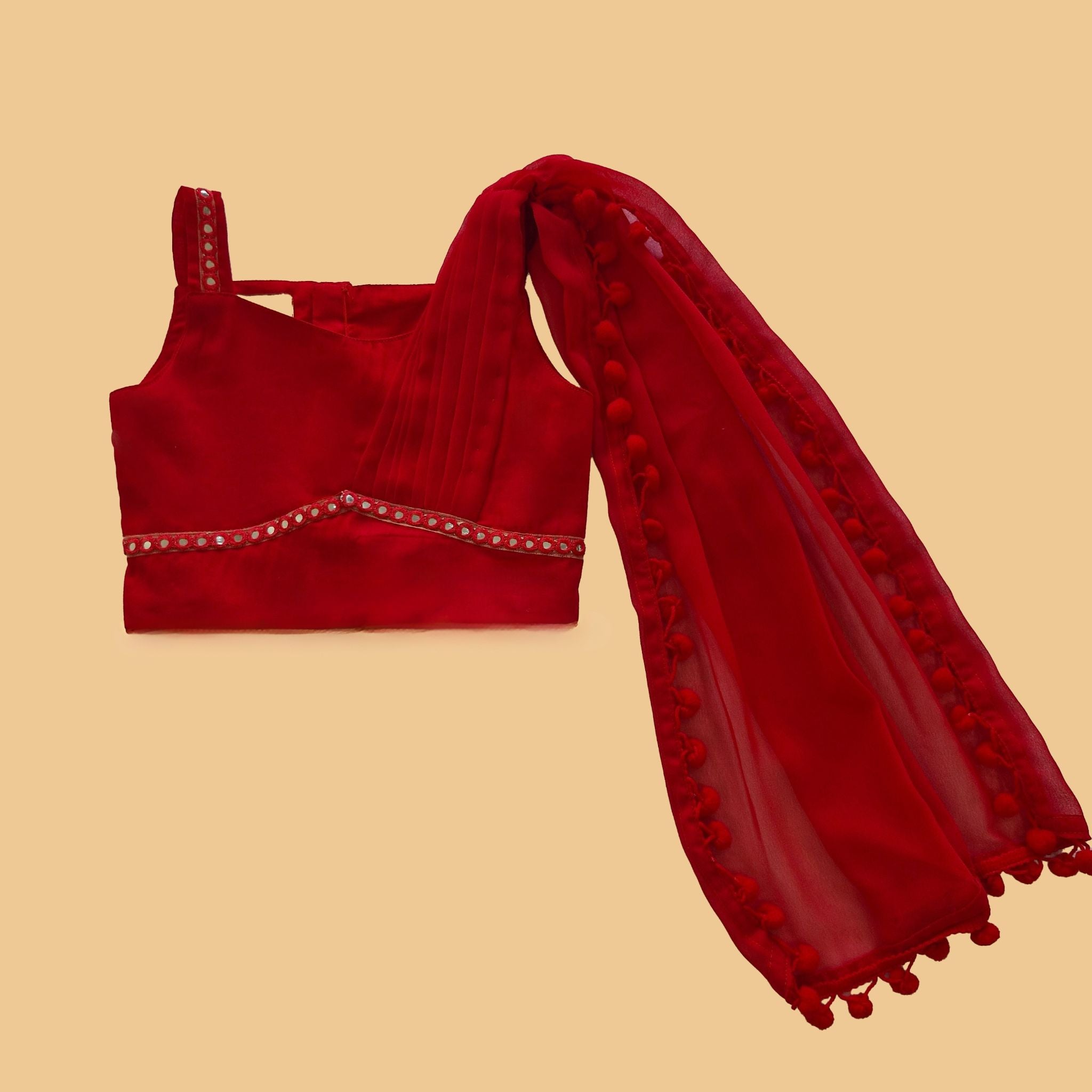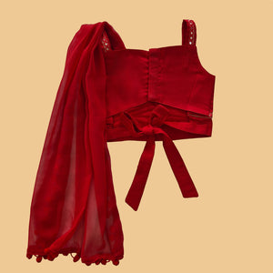 Red colored cotton satin choli embellished with mirror lace and attached dupatta.