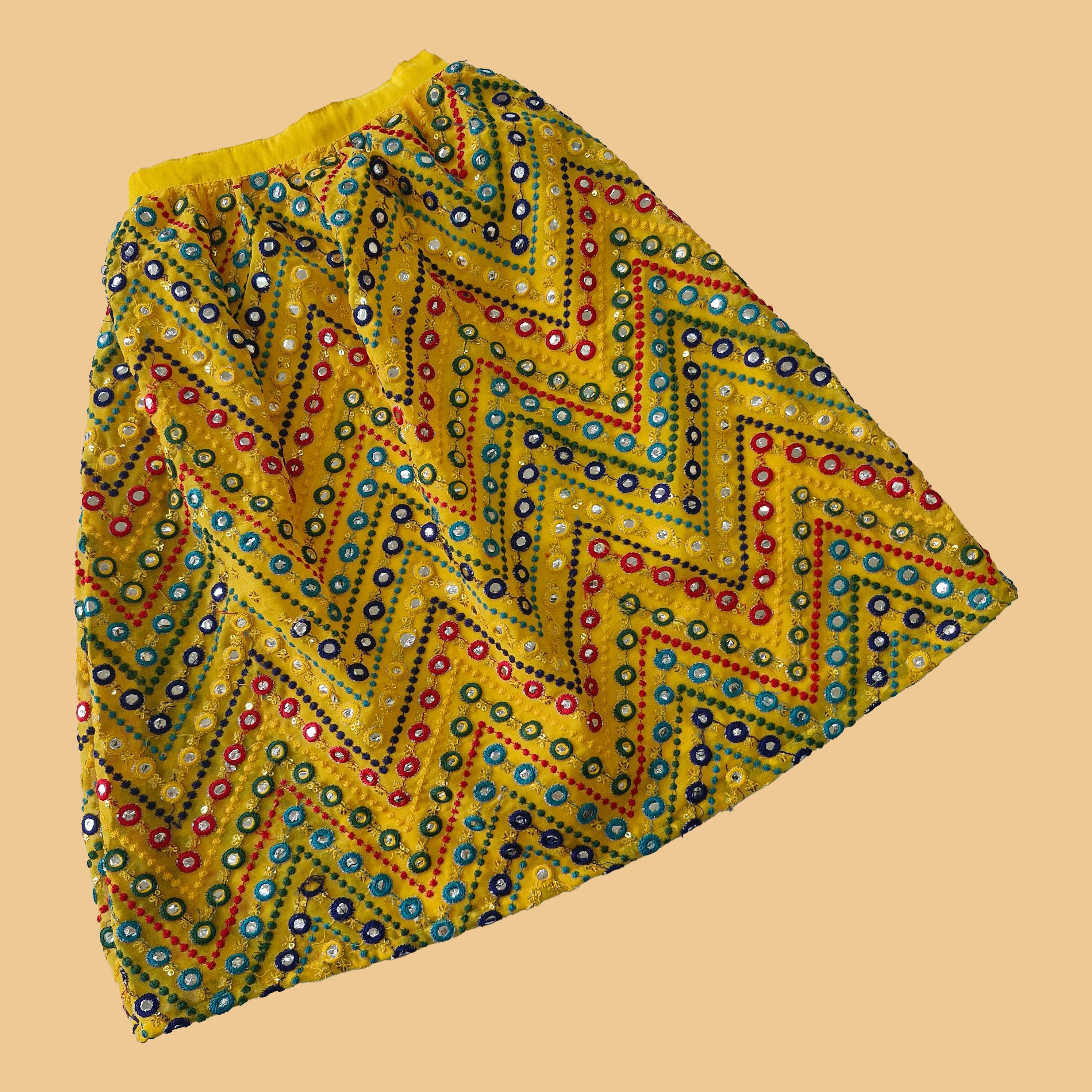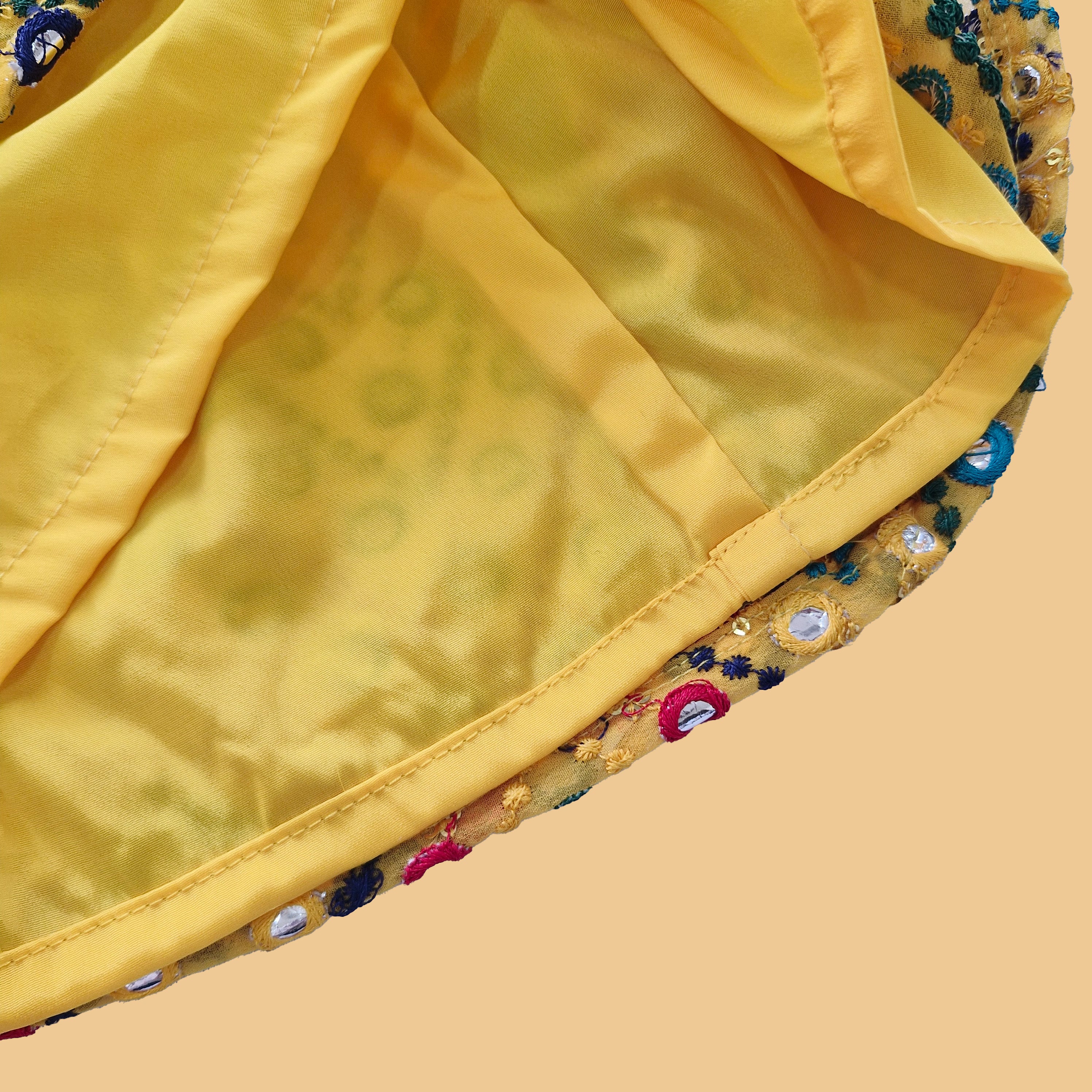 Yellow mirror work gathered lehenga with elastic at the back.
